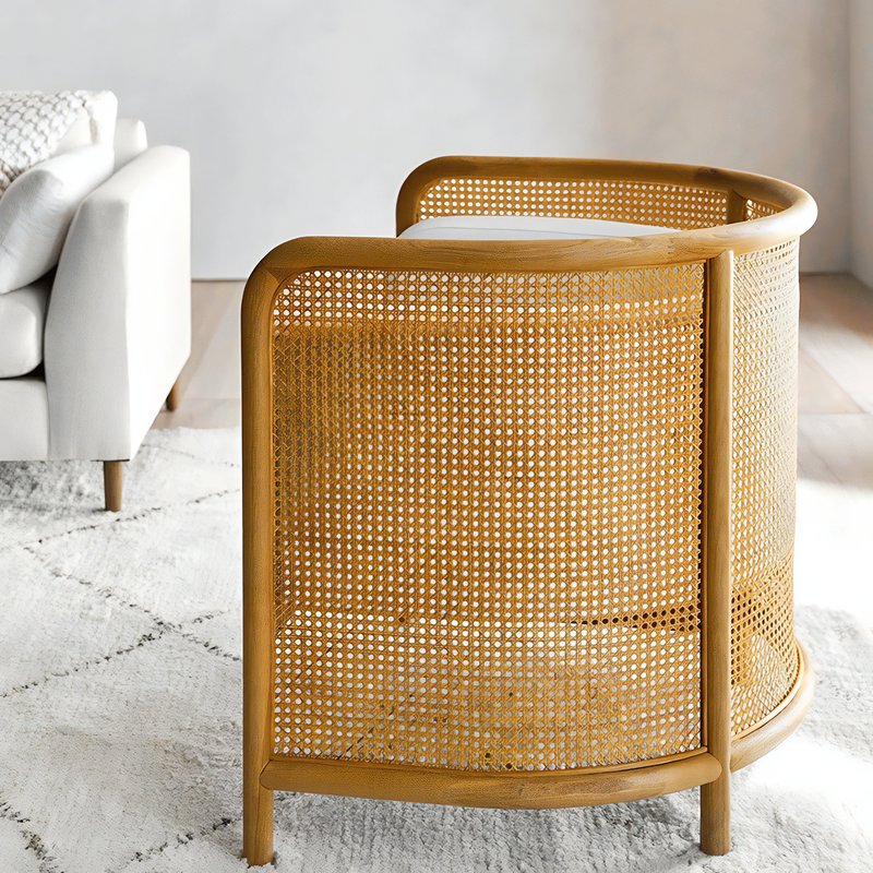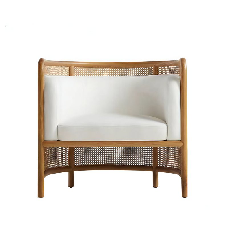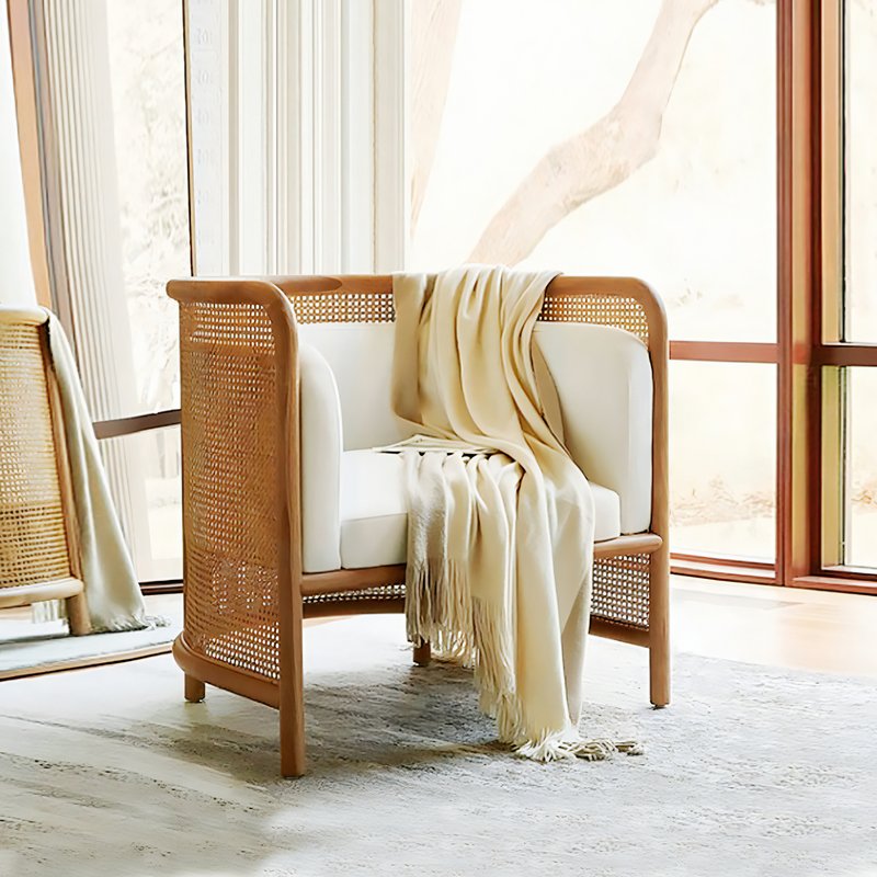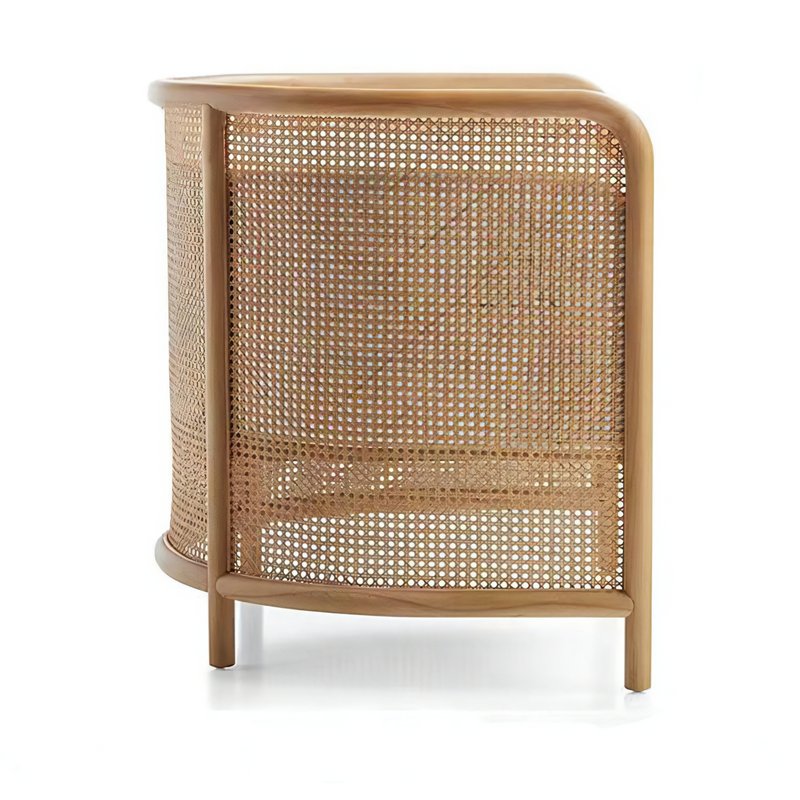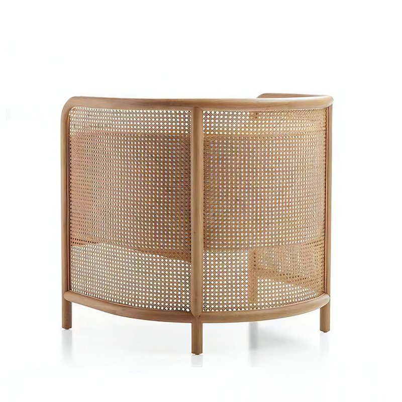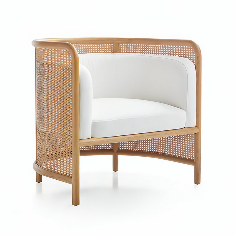 Fauteuil en rotin et bois avec coussins forme arrondie